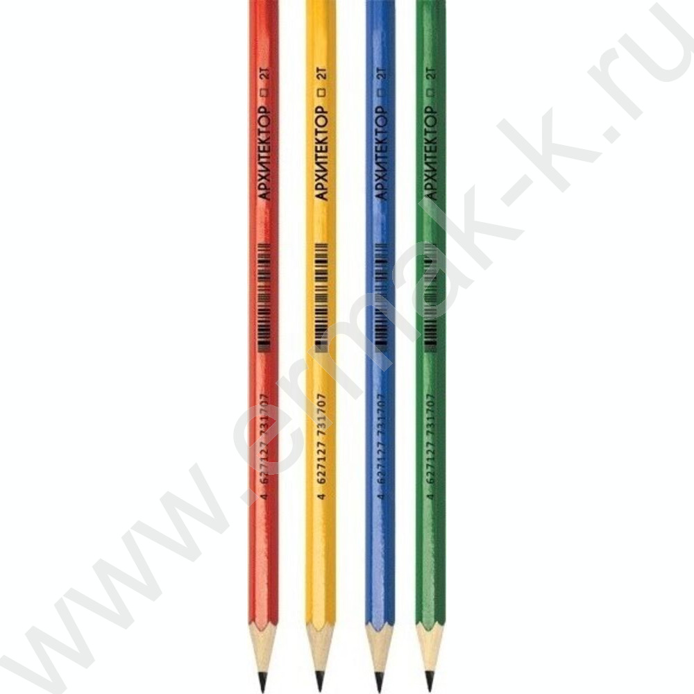Карандаш ч/гр 2Т (2Н) "Архитектор" 2мм, шестигран, заточенный, цвет корпуса - ассорти