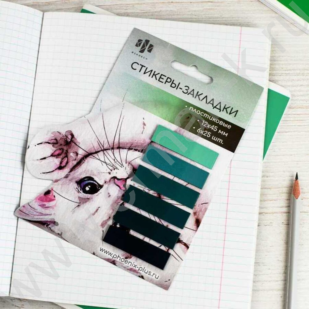 Стикеры-закладки пластиковые 12*45мм /бирюзовый 6цв*25шт Кот