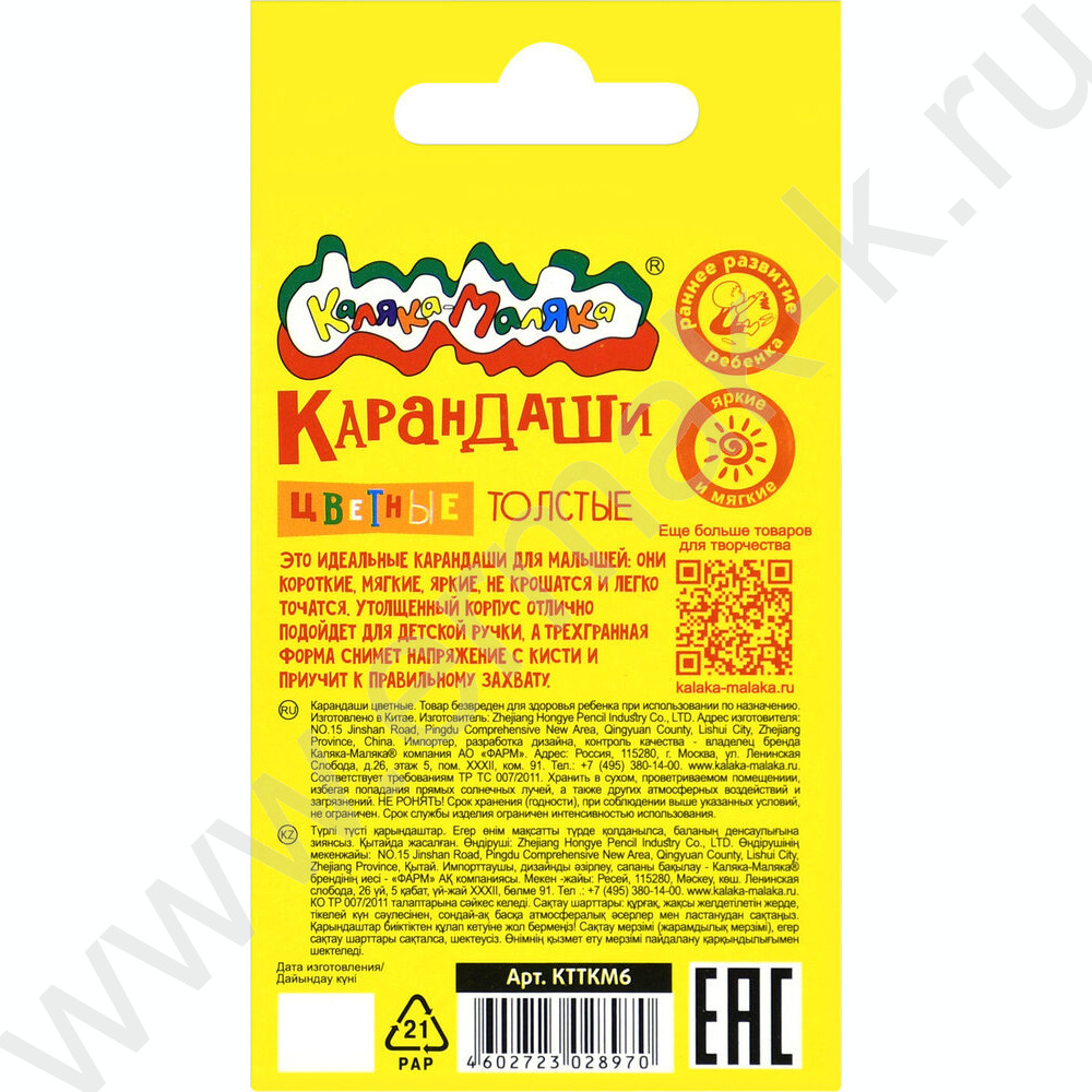 Карандаши 6цв Каляка-Маляка толстые /трехгранные/ европодвес