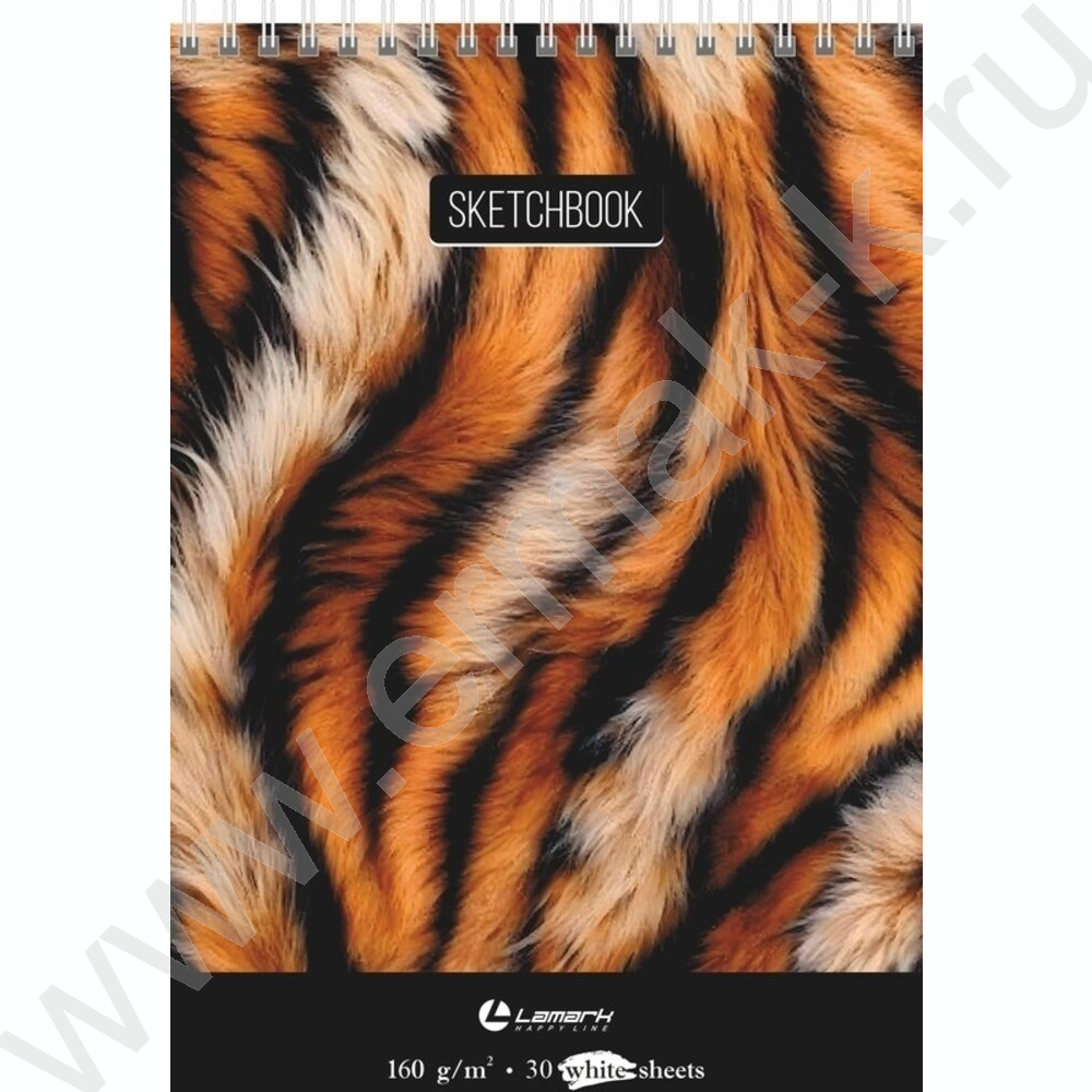 Скетчбук 30л А5 спираль сверху "Тигровый принт" /обложка-софт тач, твердая подложка, 160г/кв.м