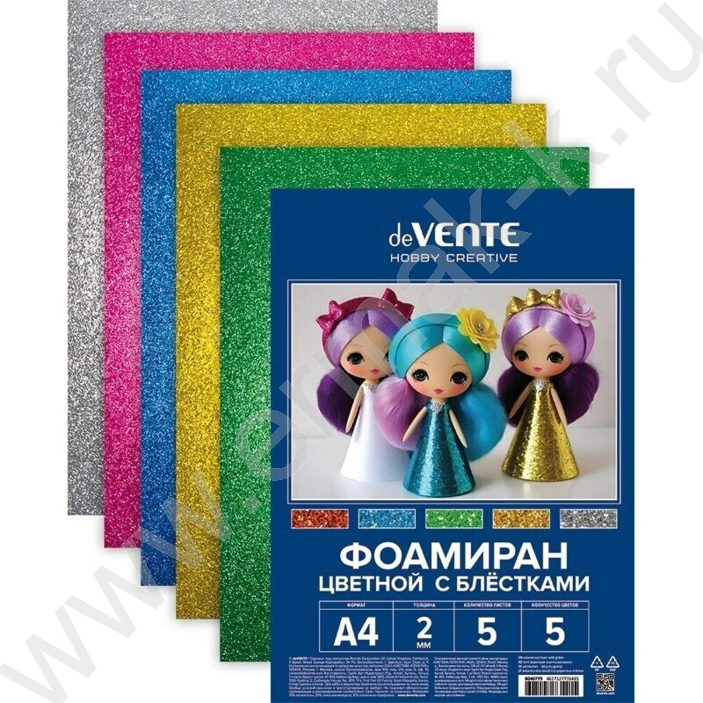 Фоамиран цветной с блёстками А4 5л/5цв 2мм пл.пакет с европодвесом