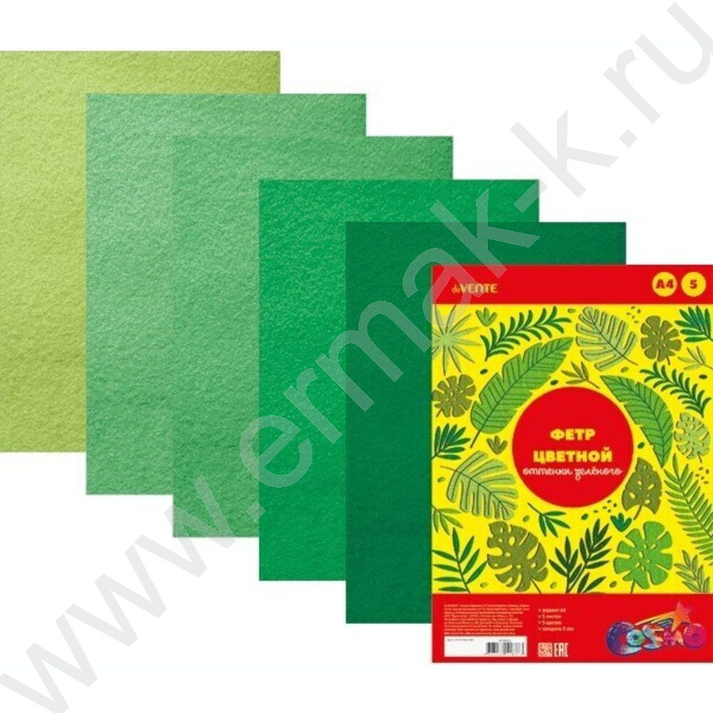 Фетр А4 Оттенки зеленого 2мм 5цв/5л /мягкий /пл.пакет с европодвесом