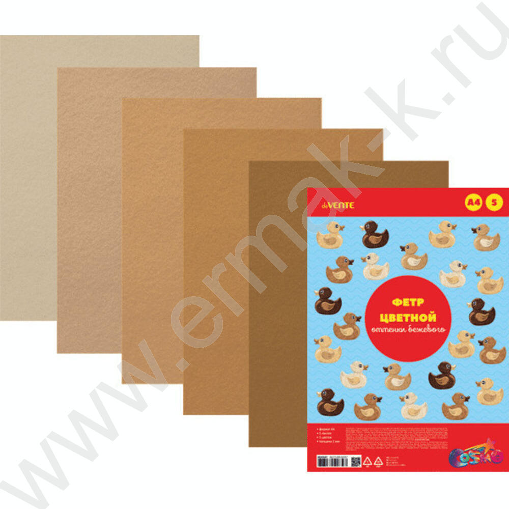 Фетр А4 Оттенки бежевого 2мм 5цв/5л /мягкий /пл.пакет с европодвесом