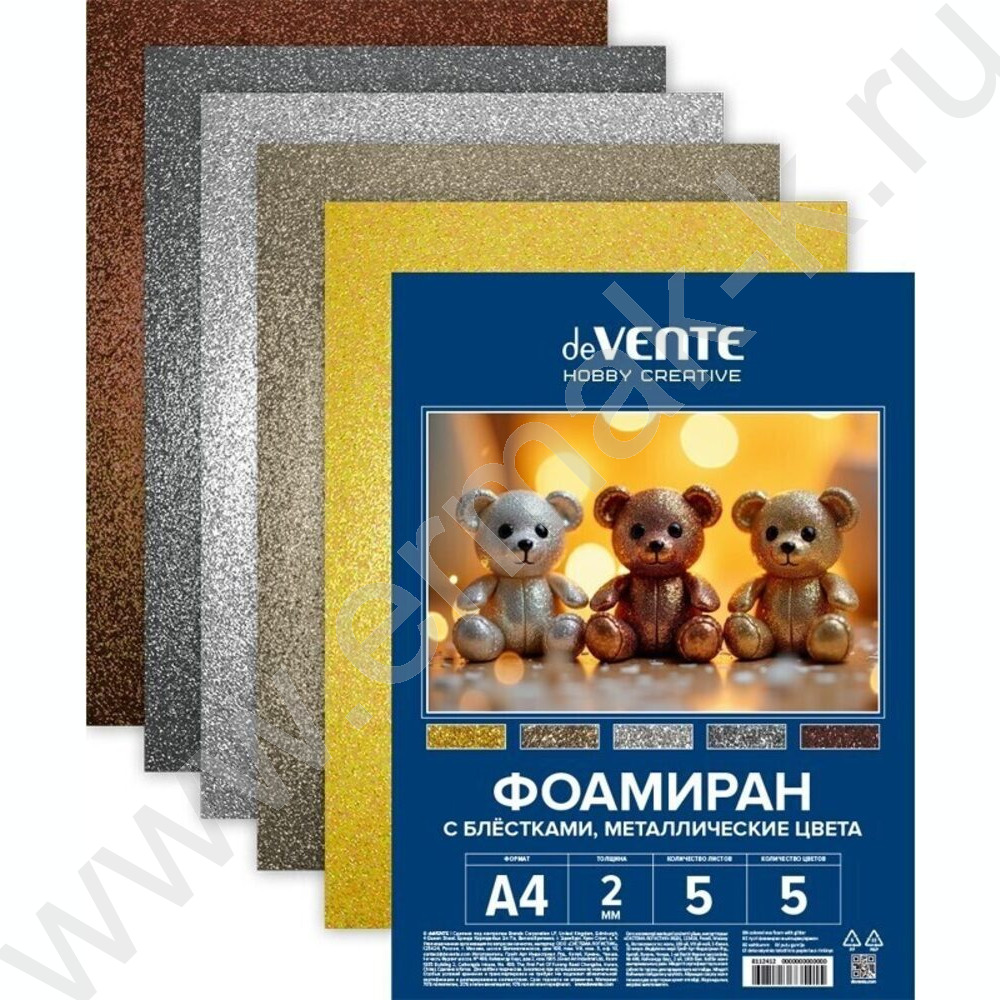 Фоамиран цветной с блёстками А4 5л/5цв 2мм "Металлические цвета", пл.пакет с европодвесом