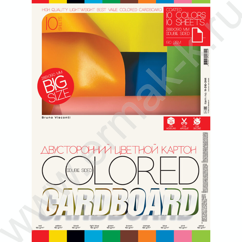 Картон цв. Двусторонний мелов. А3 10л/10цв 190 г/кв.м NEW