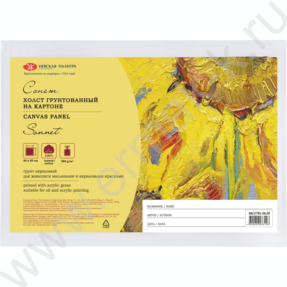 Холст на картоне 20*30 "Сонет" 280 г/м2,100% хлопок, картон 3 мм, мелкое зерно