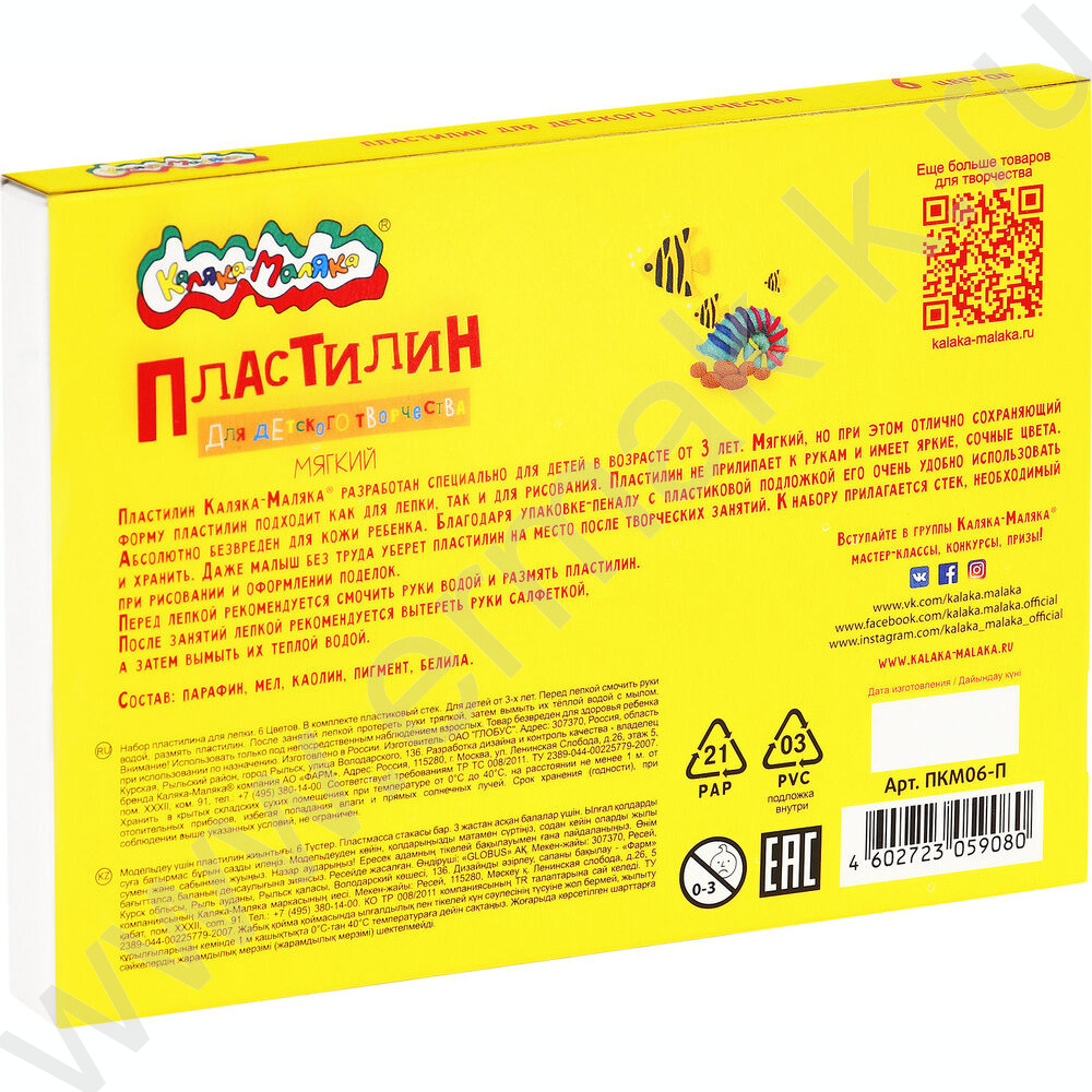 Пластилин 6цв 90г Каляка-Маляка+стек д/творчества