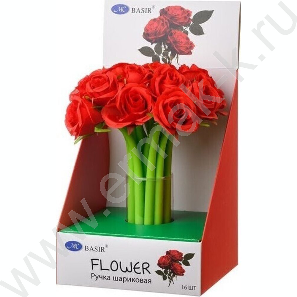Ручка шар синяя Красная роза/прорезиненный корпус зелёного цвета, наконечник цветок