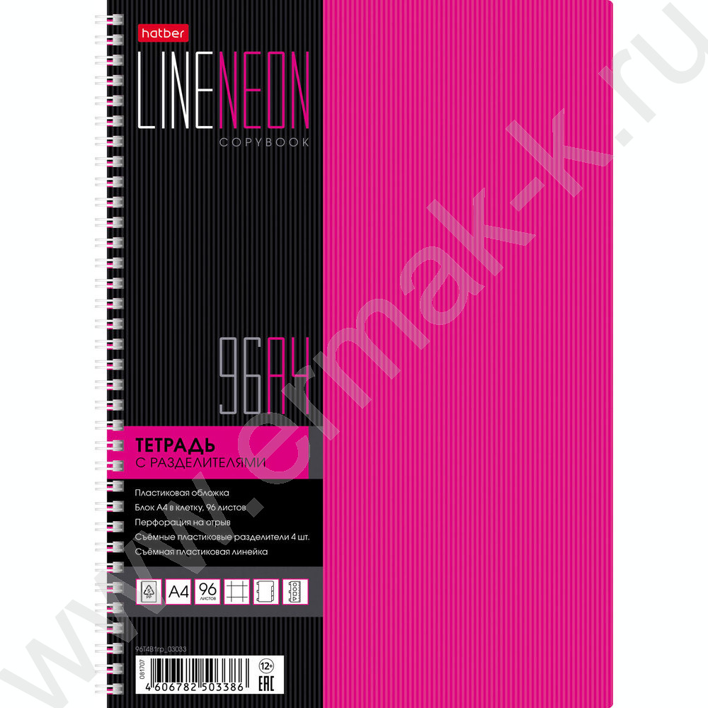 Тетрадь 96л А4 клетка/спираль/перфорация на отрыв/пл.обл./4цв.разделителя с линейкой "LINE NEON