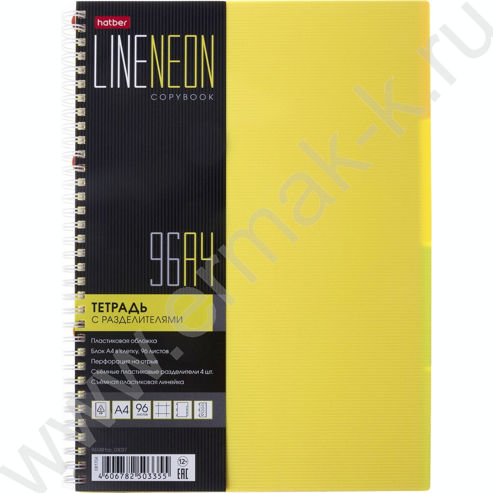Тетрадь 96л А4 клетка/спираль/пл.обл./4цв.разделителя с линейкой LINE NEON Желтая