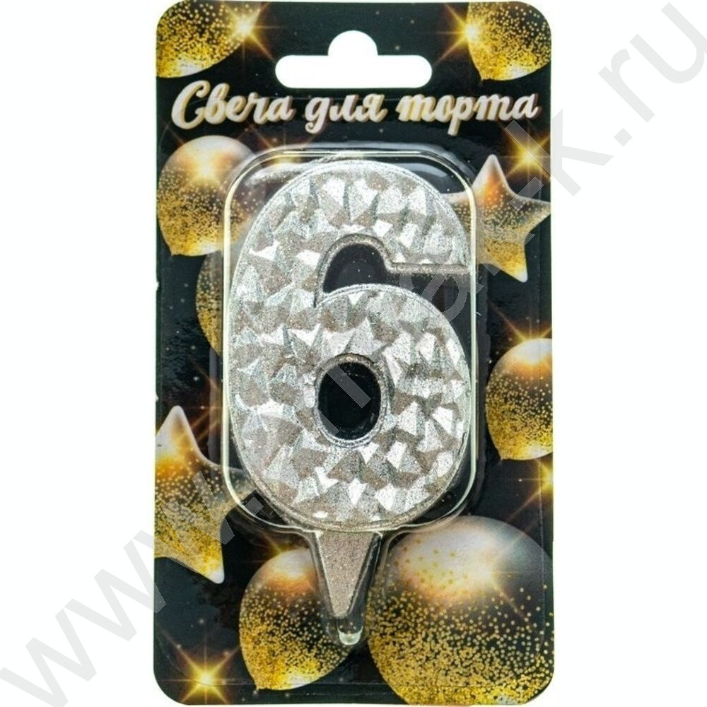 Свеча -цифра "6" тортовые Айсберг серебряная с блеском